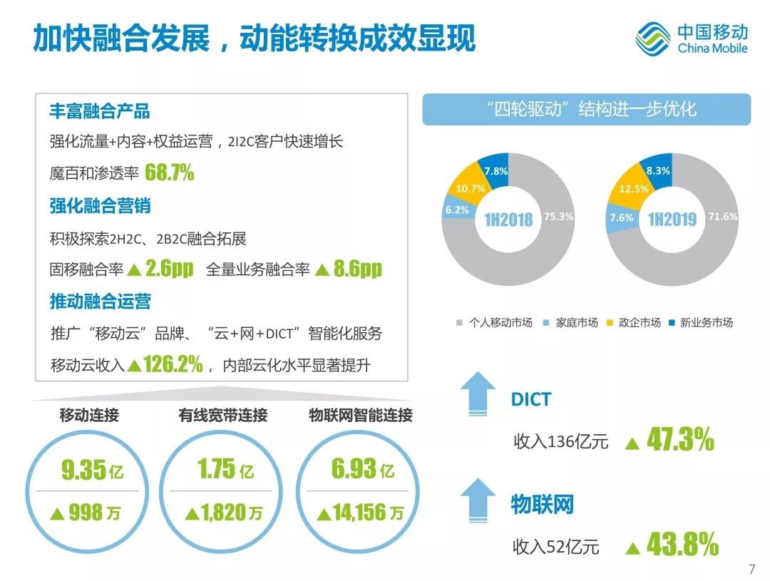 中国移动财报显示,截至2019年6月底,中国移动物联网智能连接数达到了6.93亿,新增超过1.4亿,物联网收入达52亿元,同比增长43.8%。